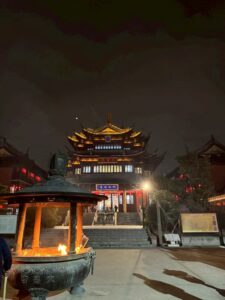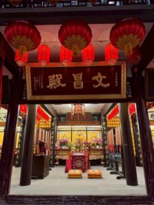 文昌宮を夜に訪れ、鼎の炎が明滅しながら軒先を照らし、殿内の「読書と善行」の対聯と廊下の「文昌黙佑」の提灯が呼応しています。墨の香りと灯りの影が交錯し、厳粛な雰囲気の中で文脈の余韻に触れ、心に何かを託すような思いになりました。